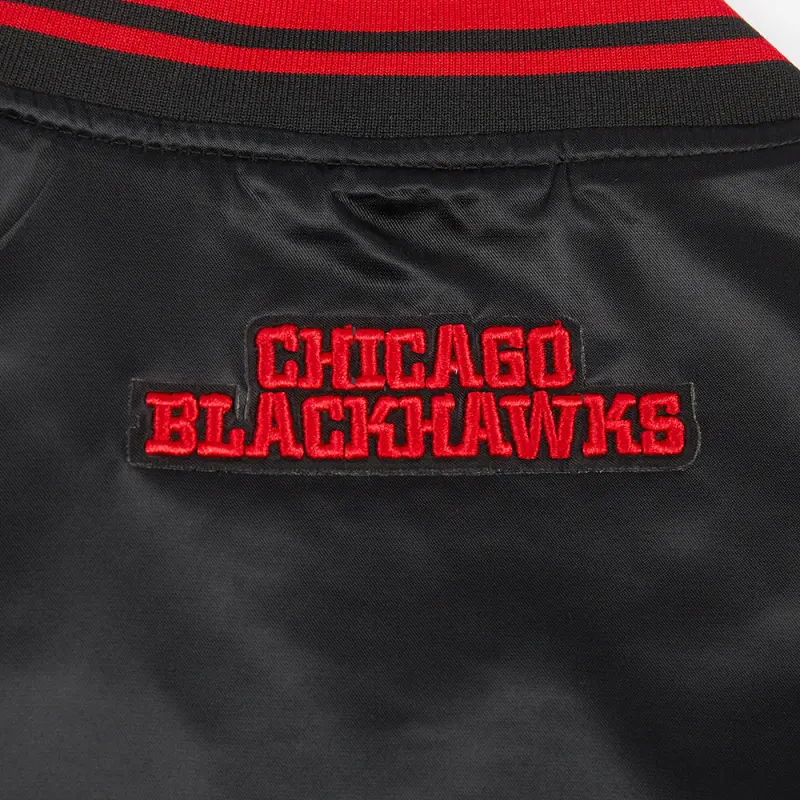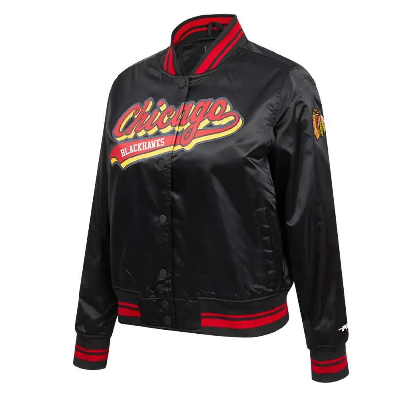 NHL CHICAGO BLACKHAWKS SCRIPT TAIL WOMEN’S SATIN JACKET (BLACK\/RED\/BLACK)